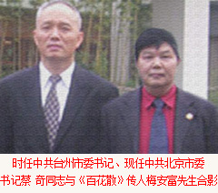 全國政協(xié)副主席、中共中央委員、中國殘聯(lián)主席鄧樸方先生與鄭州臺(tái)州商會(huì)支部書記兼秘書長(zhǎng)、《百花散》傳人梅安富先生親切交談鄭州市腫瘤康復(fù)協(xié)會(huì)名譽(yù)會(huì)長(zhǎng)。2005年5月,作為臺(tái)州古代中醫(yī)秘方梅氏《百花散》